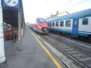 Dall’Inaugurazione di quel primo treno Torino Modane che partì nel 1854 sono passati 172 anni i terreni sono stai concessi dall’Ordine del Mauriziano , il canon e stretto con curve ha solo due binari, il tratto seguiva quello dell’antica Bealera che serve 26 comuni con una deviazione l’acqua entrava tramite un canale scavato apposta nel Monastero fu costruito un ponte dove passava la ferrovia e sotto l’acqua della Bealera, un’altro ponte fu costruito all’ingresso del Monastero con mura imponenti che giravano intorno al concentrico erano di protezione del ponte e delle costruzione sulla collinetta, gli Antoniani avevano costruito il Convento, il Monastero, la Chiesa con il Presbiterio, il Campanile , il Chiostro, il Battistero etc… Oggi su questi binari passa l’alta velocità i TGV il Freccia Rossa, i treni che trasportano le merci ed i due treni per Susa e Bardonecchia , rosta non era una stazione di fermata. Questo tratto con treni ogni mezzora ,alternati ai treni merci e l’alta velocità e uno dei Snodi più trafficato d’Italia , i contadini fittaioli che coltivano i prati utilizzano il metodo medievale per l’iirigqazioned dei campi con i canali e paratie di deviazione, anche alla la base per l’apertura dell’acqua della bealera ci fu una deviazione nel cuore di Ranverso per fare arrivare ai campi attraversando sotto terra Ranverso era nei pressi del corridoio degli stemmi.